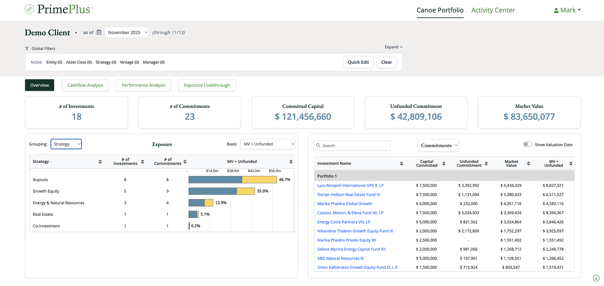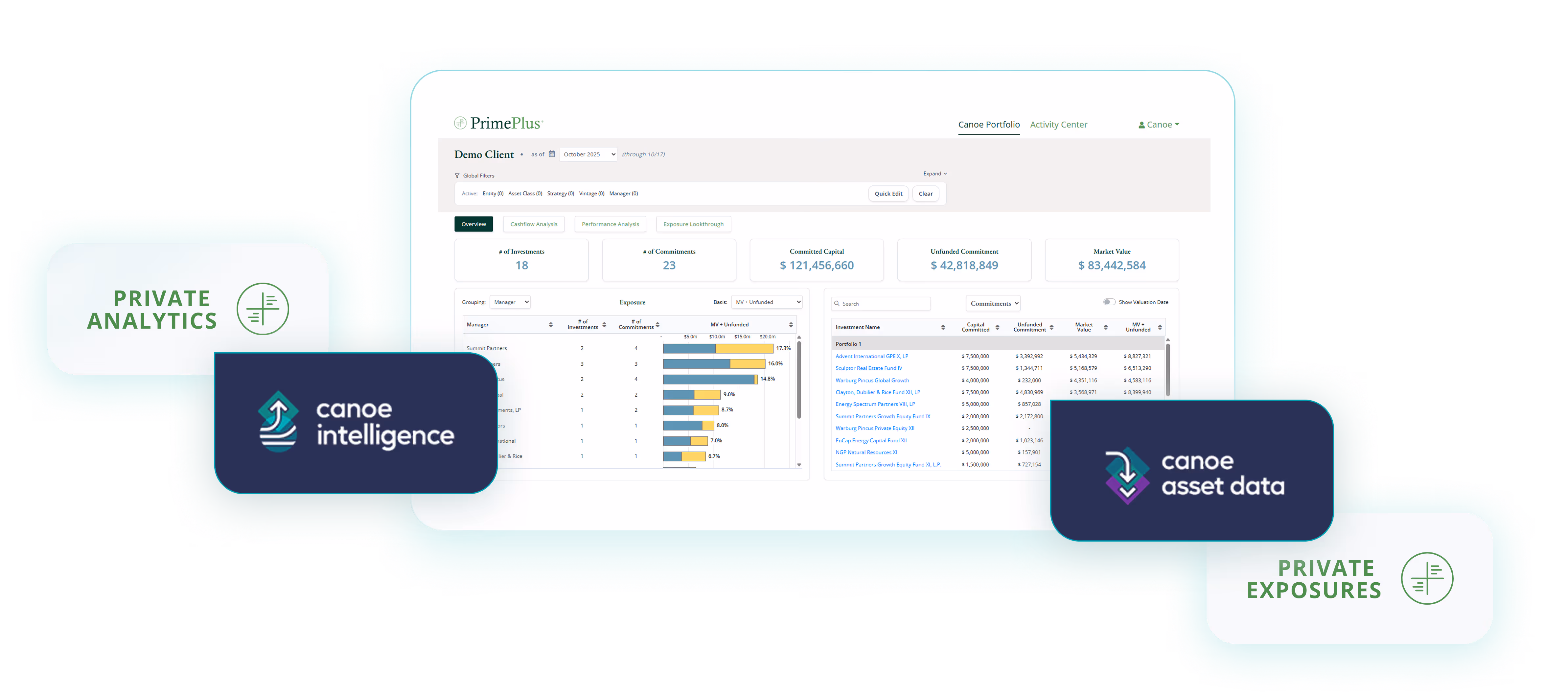 As an early client of Canoe, Prime Buchholz depended on Canoe's document gathering and data automation to service their 250+ institutional clients. Now refined across hundreds of end clients, the Canoe x PrimePlus integrated offering is available to the broader alts ecosystem as a battle-tested pathway to private analytics and exposures.