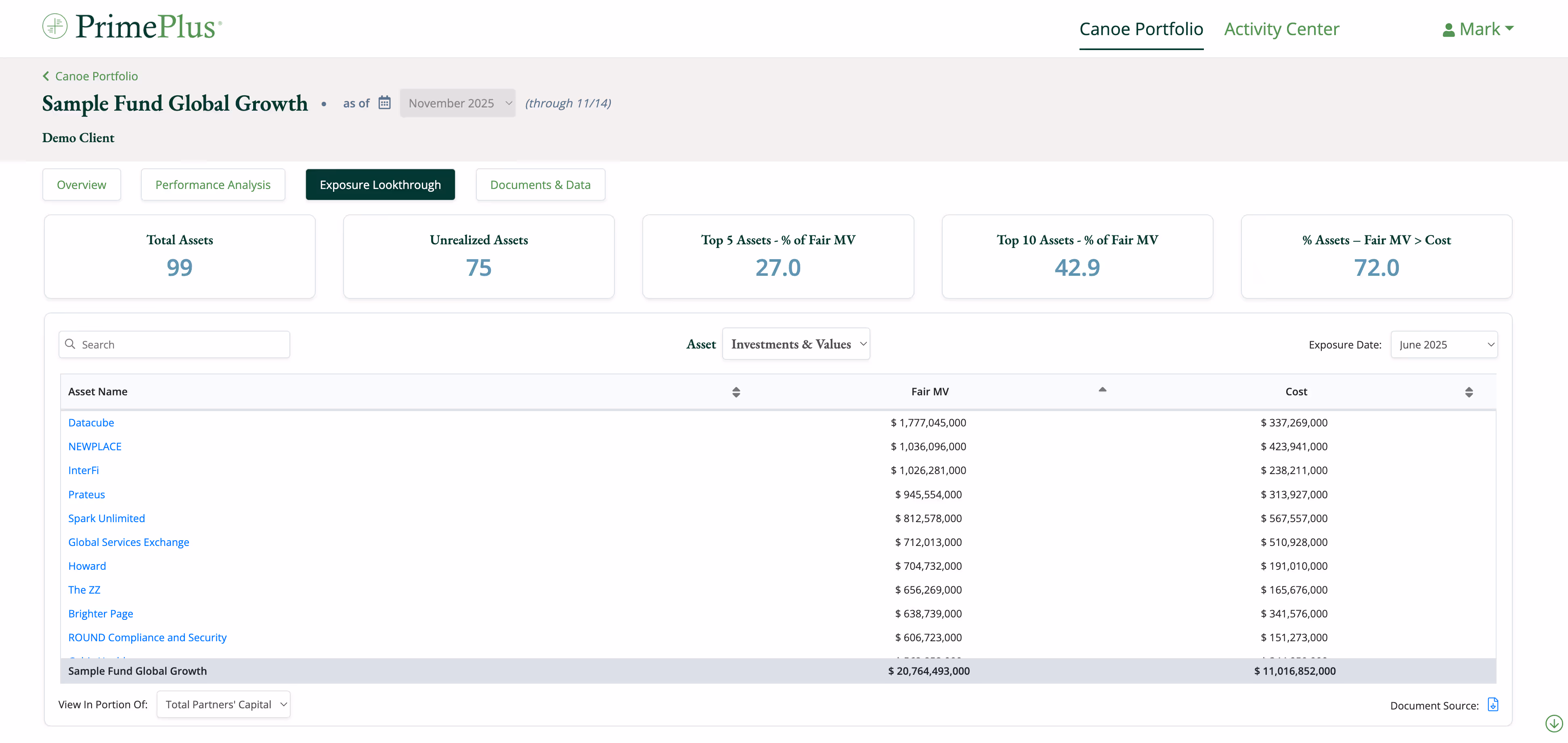 Every Canoe fund allocation is supported in PrimePlus with consistent visuals, valuation data, detailed capital activity data, and related document links.